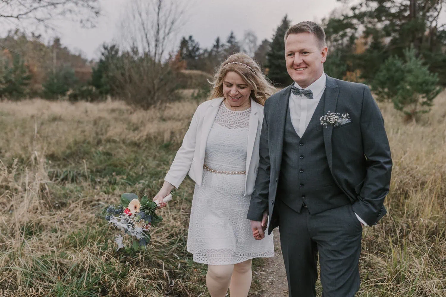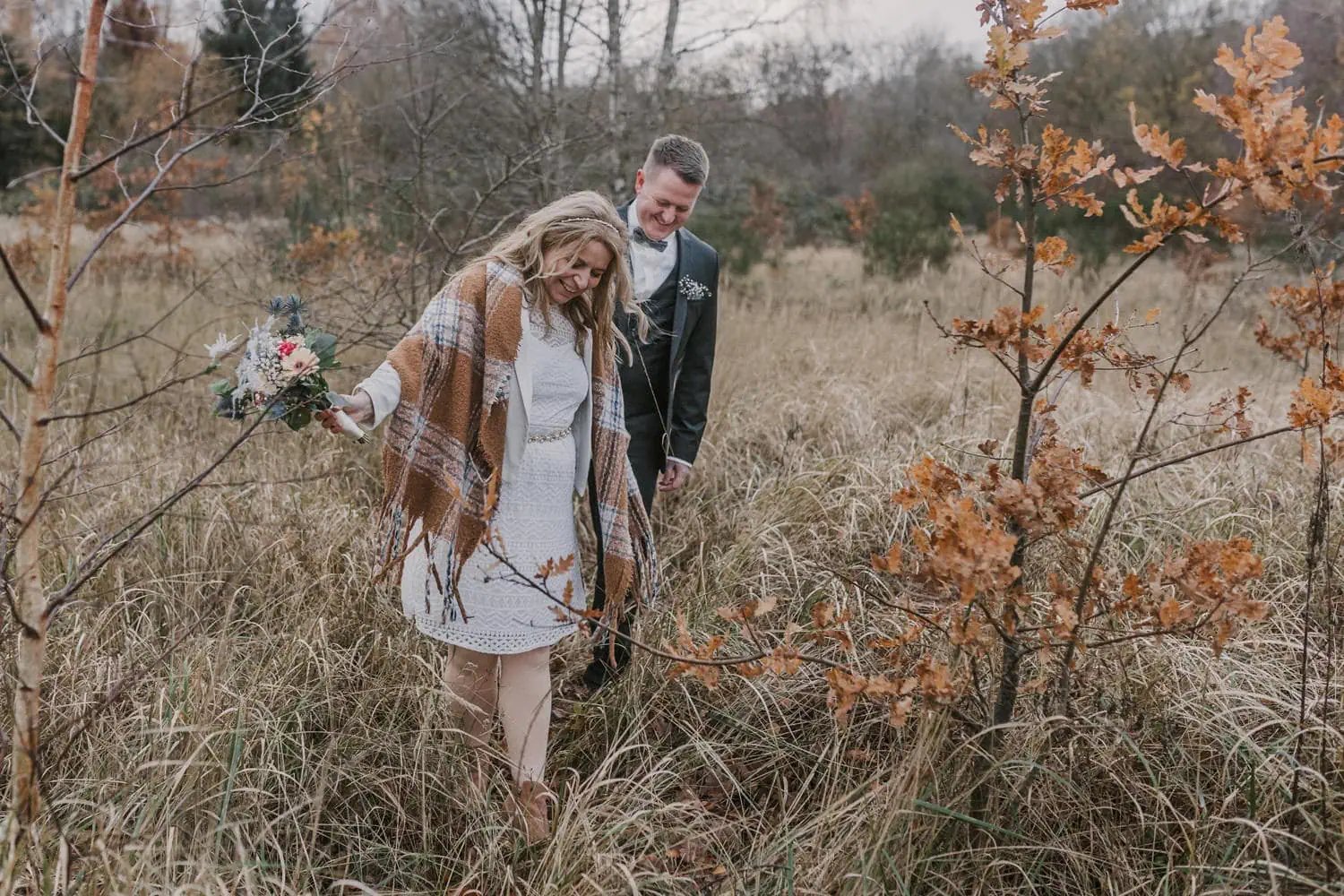 Schnee haben wir hier im Norden ja leider sehr selten. Aber ein Hochzeitsshooting im Winter hat trotzdem seinen ganz eigenen Charme. Denn von der Kälte haben sich die Beiden nicht beirren lassen – ganz im Gegenteil! Mit ihrer Liebe, viel Kuscheln und viel Bewegung haben sie die frostigen Temperaturen ausgeblendet und den Moment in vollen Zügen genossen.Die klare, frische Winterluft sorgte für eine ganz besondere Atmosphäre. Die Natur zeigte sich von ihrer ruhigen Seite: kahle Bäume, helle Gräser, weiches Licht und Stille – und genau das macht Winter-Shootings so besonders. Für mich als Hochzeitsfotografin sind solche Bedingungen perfekt für tolle Hochzeitsfotos.